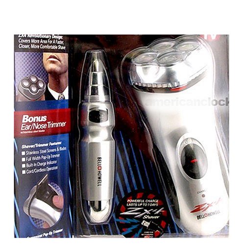 Rechargeable shaver with Pop-Up trimmer goes everywhere you go. The 4 head design is more comfortable than the standard 3-head designs. This rechargeable safety shaver cover more area for a faster, closer shave. You'll be impeccaby groomed wherever you find yourself, at home or on the road. Includeds Ear/nose Trimmer.Bell and Howell Shaver and Trimmer