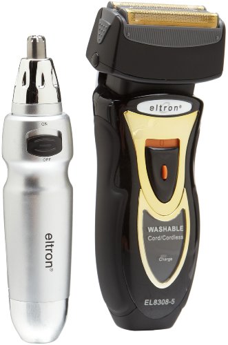 Eltron el-8303 Men's flexible/pivoting shaver with personal trimmer is washable fore ease in cleaning. Triple heads float independently. Multi-flex and pivoting head to follow facial contour.Eltron el-8308-5 Wet/Dry 3 Head Rechargeable Shaver with Ear Nose Trimmer