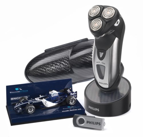 | An Amazon.com Exclusive Offer! The very best from Philips Norelco for the Formula 1 racing enthusiast! The Limited Edition Philips Norelco 9199XL SmartTouch-XL electric razor combines the technology and innovation of Philips Norelco with the engineering excellence of the Williams F1 Racing Team. This revolutionary razor brings together Speed-XL shaving heads with the unique SmartTouch Contour Following System for up to 50% more shaving surface adjusting optimally to your skin resulting in a faster, closer shave. This is encased by a body made from the same materials used in the Williams F1 racing car. This product also features materials not found elsewhere. A strong, lightweight carbon fiber travel / storage case and carbon fiber charging stand add to this razor’s visual and functional appeal, while its Certificate of Authenticity reassures you that this is a one of a kind electric razor. A replica of the 2006 Williams F1 car also comes in the package as well as a Philips USB memory stick featuring media content from Williams F1 driver, Mark Webber. Every component and feature has been fine-tuned to make sure this is the best razor designed for the Formula 1 fan who demands the best of the best. | |